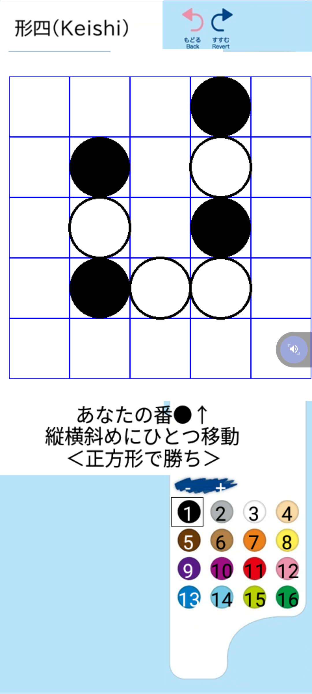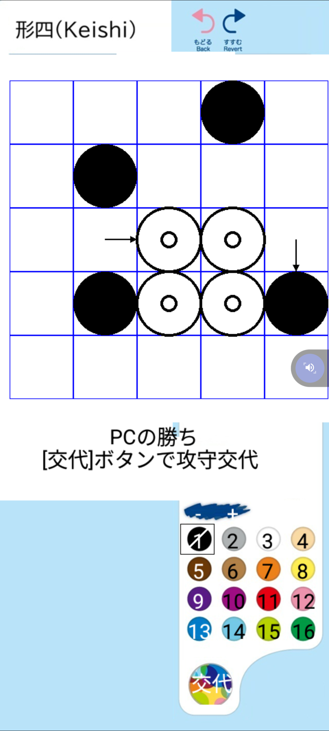 | 11 | 形四は、1972年山本蛍(雅方第一世名人)が、中学校のときに考案したゲームです。その後、1976年に友人の大和団次郎がパソコンゲーム用に簡略化したルールを提唱しました。白黒4つのコマを交互に移動させ、正方形をつくったら勝ちという簡単なルールですが、奥が深いゲームです